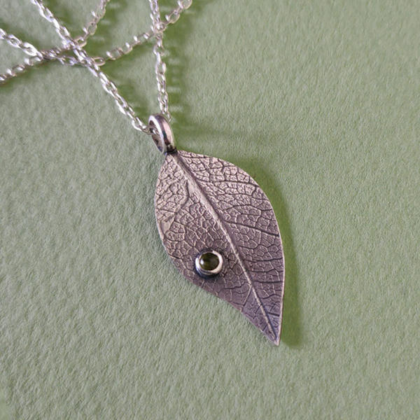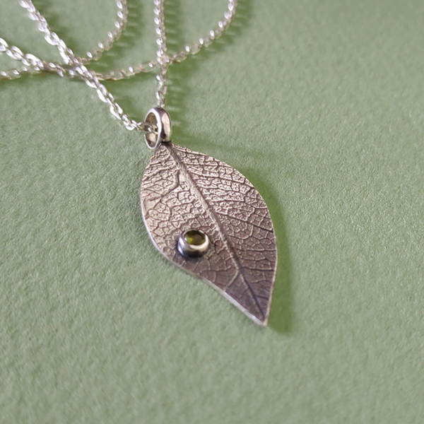 · Hoja tamaño 1,5 x 3 cm · Piedra turmalina verde 3 mm. · Cadena tipo "limada 1", largo 50 cm