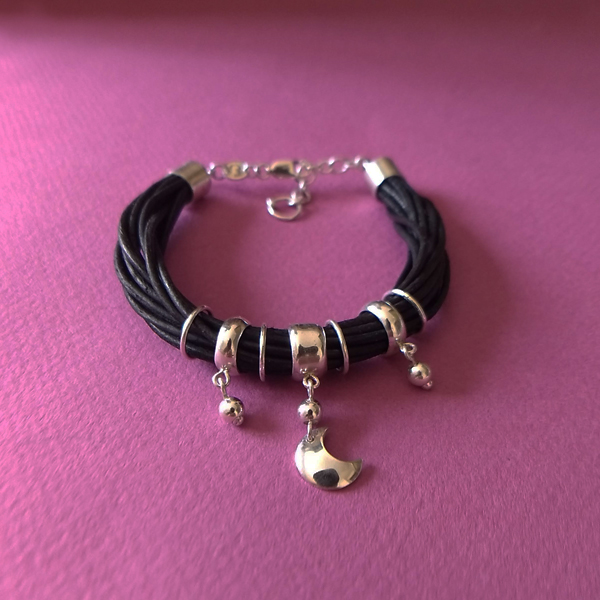 Pulsera de tiras de cuero redondo, con detalles de plata y piedras.