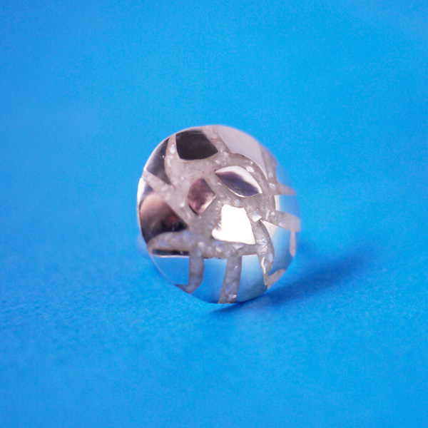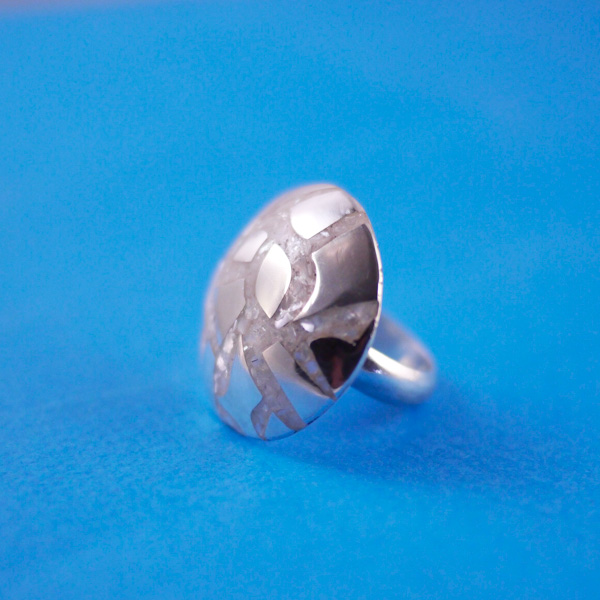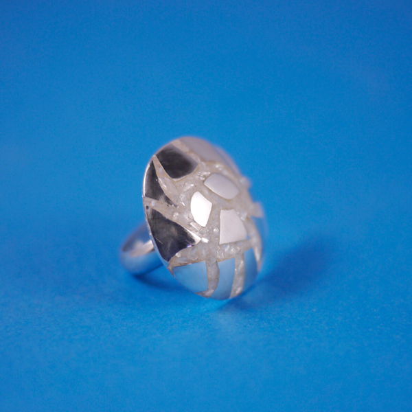 Anillo con mosaico de nacar y de plata, la forma del mosaico de plata dependerá del material que se tenga por lo tanto tu anillo sera único ya que el patrón no se repite.